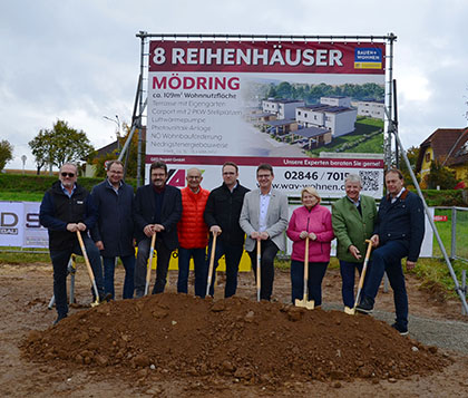 Mit dem feierlichen Spatenstich fiel der Startschuss für die dritte Reihenhausanlage in Mödring. Die Doppelhausanlage besteht aus 8 Wohneinheiten in moderner Niedrigenergiebauweise. Die Häuser werden in nachhaltiger Holzbauweise vom Holzbau-Spezialisten GED Wohnbau errichtet.