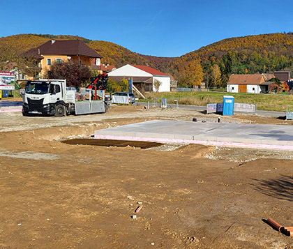 Ende Oktober wurde mit den ersten Erdbauarbeiten begonnen. Anschließend wurden auch die Fundamentplatten betoniert, die inzwischen von SolidBAU fertiggestellt wurden. Nun kann bald mit der Hausmontage begonnen werden.