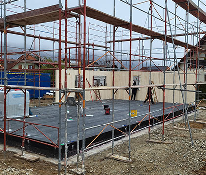 Mit dem Aufstellen der ersten Holzwände wurde gestartet. Nach rund vier Wochen waren alle Wohneinheiten fertig aufgestellt und es konnte mit den Flachdächern begonnen werden.