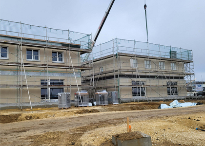 Anfang Dezember begann das Generalunternehmen Hartl Haus mit dem Aufstellen der ersten Doppelhauseinheiten. Auch die Fenster wurden bereits eingebaut.