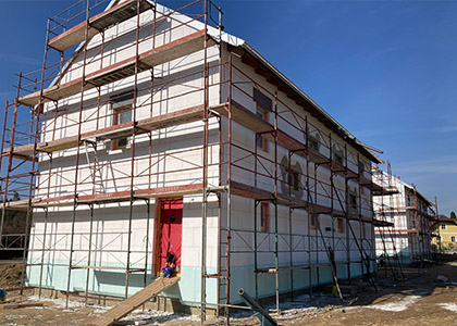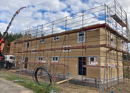 Die Baustelle schreitet zügig voran. Nach der Verlegung von Kanal-, Wasser-, Elektro- und Glasfaserleitungen wurde mit der Hausmontage begonnen. Bereits Ende Oktober standen die fertigen Häuser. Auch die Dachdecker und Spengler Arbeiten wurden abgeschlossen.